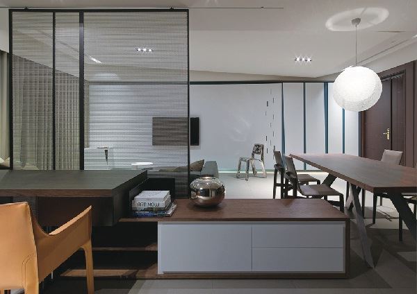 Home Data 建築形式:電梯大樓 房屋狀況:新屋 座落地點:台北市 居住成員:4人 空間坪數:80坪 空間格局:客廳、餐廳、廚房、書房、主臥、主臥衛浴、男孩房2間、客用衛浴 主要建材:烤漆玻璃、橡木染白、表布、金屬珠簾、金屬馬賽克、黑金鋒大理石、美耐板、拋光石英磚、訂製家具 如果有人問你「H o m e」和「House」的差別在哪哩,你的回答和解釋會是什麼?這兩個單字指的難道不都是一間房子嗎?對於重視居家調查,並以人的生活需求與習慣為設計出發點的演拓設計來說,這兩個單字絕對代表不同的意義,因為home具備的是考量居主者每個生活細節後所產生的空間,而house只是有著裝潢和家具,卻少了人性化生活設計的房子而已。 演拓空間室內設計設計師張德良表示,在居家調查之外,現在他們更開始重視燈光與情境的營造,目的就是希望讓居家空間更有人味與氣氛,透過燈光控制系統將燈具的開關整合,屋主只要按一個鈕,就能利用設定好的燈光明暗創造空間層次,隨心情與需求再進行光線的微調,也能達到確實省電節能的目的。 從客廳通往各個房間,必須經過一個狹長的走道,設計師為了降低空間壓迫感,特別在還不到盡頭的走道處,設計了一個訂製燈區,利用具有特色的燈具及透出的溫暖光線,達到緩衝的效果,當行走在走道上時,不但不覺得狹窄,反而有種柳暗花明的驚喜感。 從大門進入的玄關,是以簡單但具有質感的設計為出發,而設計師為了區隔玄關與客廳,特意以地板顏色做為分界,於是採用和客廳淺色拋光石英磚不同的金屬馬賽 克與黑金鋒大理石,利用地板的顏色深淺不一,讓空間區域的轉換更為明顯。
