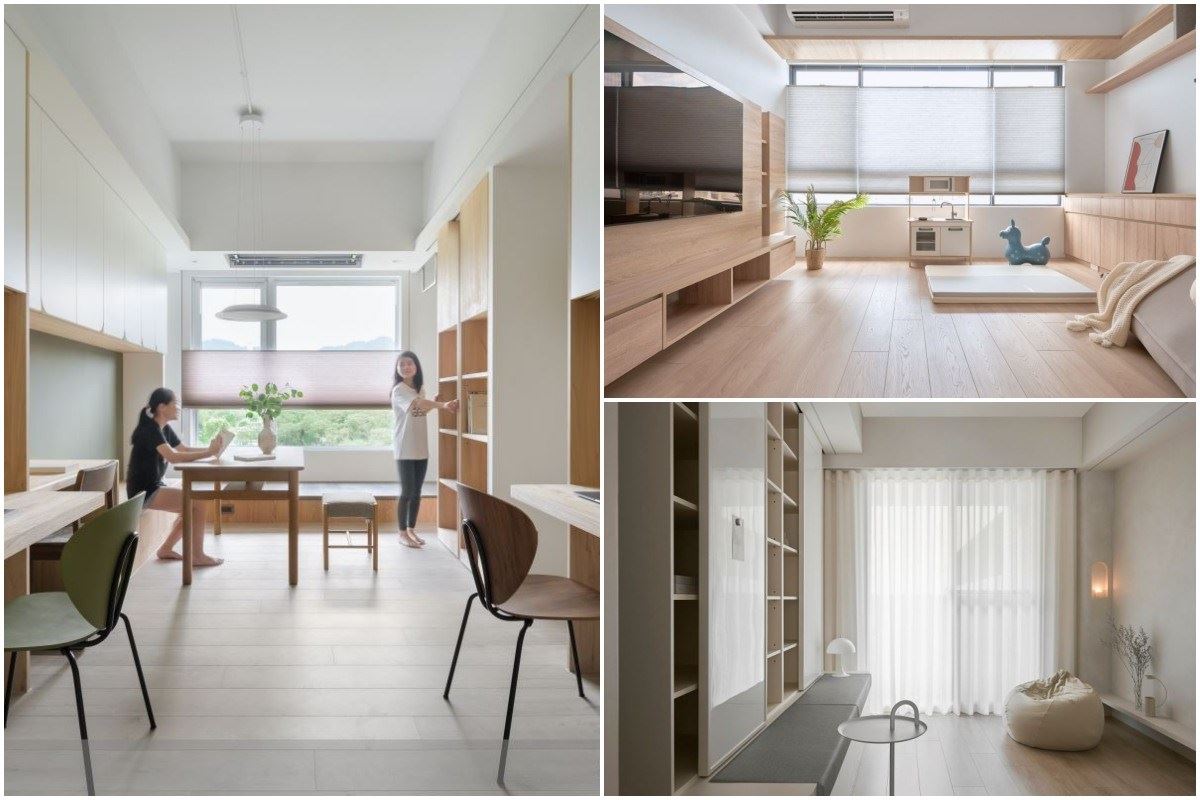 由於空間坪數僅有22坪,且客廳到餐廳之間是呈現L型的動線,因此空間的規劃以及如何將機能巧妙包覆是設計工作最大的考驗。在玄關處,設計師先利用光源效果放大空間,破除空間的狹小與壓迫感,而玄關的鞋櫃設計則是與廚房的電器櫃雙面運用,讓櫃體兼具隔間與收納效果。客廳設計強調的是休閒與舒適感,在靠窗處利用臥榻區的設計帶來和式房的效果,臥榻下方也配置收納機能,讓空間的實用性更加提升。