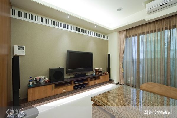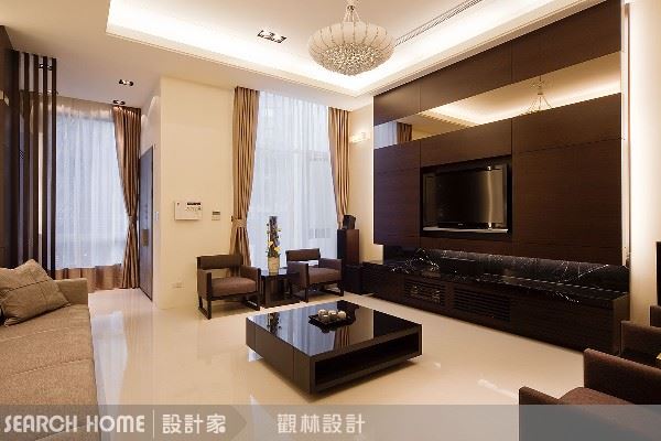 利用復古的電視櫃與桌几確立空間的主題後,再藉由燈光及抱枕等營造溫暖的整體氛圍。深淺互搭的色彩運用,讓整體空間在沉靜的休閒味道中,又同時帶有溫暖的居家氣息。