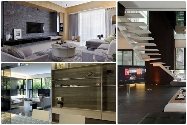 客廳的電視牆面同時也是客廳與書房的隔間牆,為了保持空間的視覺穿透感,並且減輕天花板的壓迫感,設計師將電視牆面上方設計為清玻璃,不但具有隔間功能,並且維持了空間的整體性與層次感。
