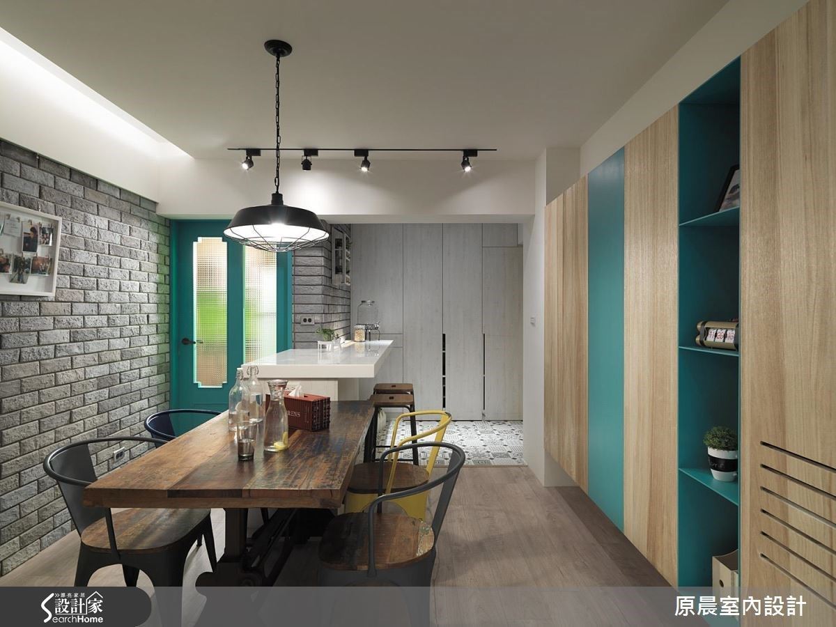 由於餐廚空間連在一起,設計師在餐廳上方的天花板特地做了裝修,並搭配一盞造形簡單的吊燈,一方面以灰色呼應電視牆的色調,另一方面也創造視覺重心,讓用餐氣氛更好,也帶出了餐廳空間的整體感。