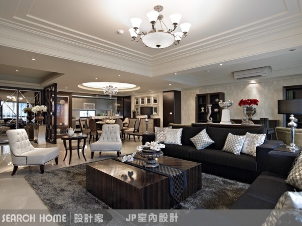 地毯的鋪設決定了時尚的基調,材質多元且造型各異的茶几和桌椅凸顯出國際混搭那難以令人抗具的魅力風情,設計師在客廳後方的牆面設置整面的造型書櫃,將閱讀區的機能也join到公共區域。