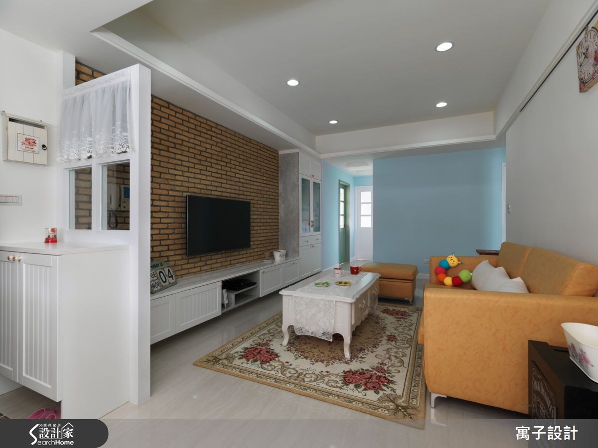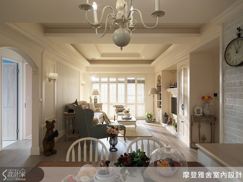 主牆面以左右對稱的鄉村風格櫥櫃,搭配中間裝飾用火爐造型,使視覺上呈現溫暖、溫馨的氛圍,而另一端的牆面則以簡約如企口牆板處理創造出勻整的線條,將視覺焦點集中在主牆的設計上。