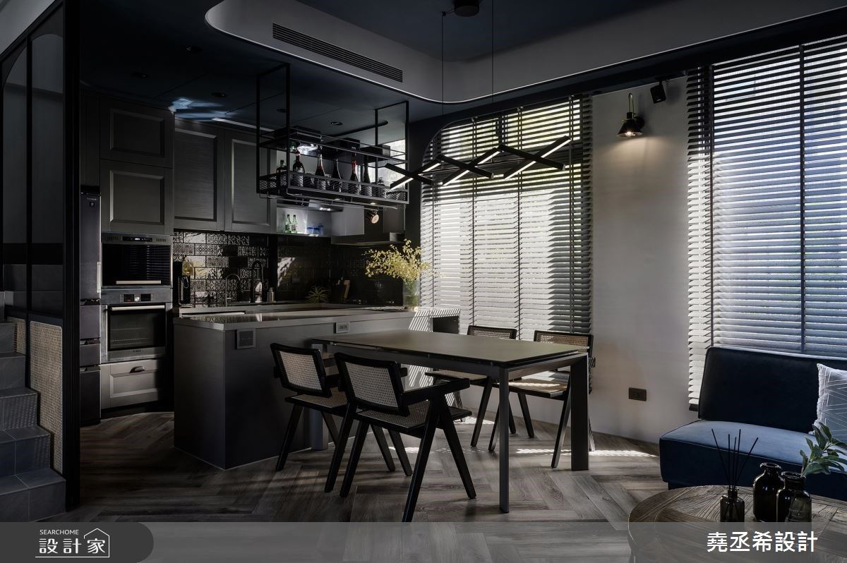 選用輕玻的材質可使家具更加輕巧時尚!在客廳旁設立的「7」型吧檯,灰白色的基底包覆著玻璃材質,顏色與牆面相似,達到瞬間隱形的效果,在妥善運用空間的同時,降低視覺上的複雜感。