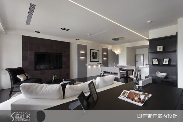 空間的色調上以白、金色為基底,適時加入黑色,局部加些女主人喜愛的紫色及男主人喜愛的銀色,帶出奢華低調的情境氛圍;進入玄關,馬上就被黑白古典水晶吊燈剪影鏡面主牆所吸引,搭配客廳公共空間的反射巴洛克花紋壁紙、巴洛克黑白鏡面,訂做的黑白深淺時尚沙發,展現絕佳的配色技巧,雷射雕花圖案鏡面不但成功讓空間散發藝術人文質感,也讓客廳的視覺延伸,比例更趨完美。