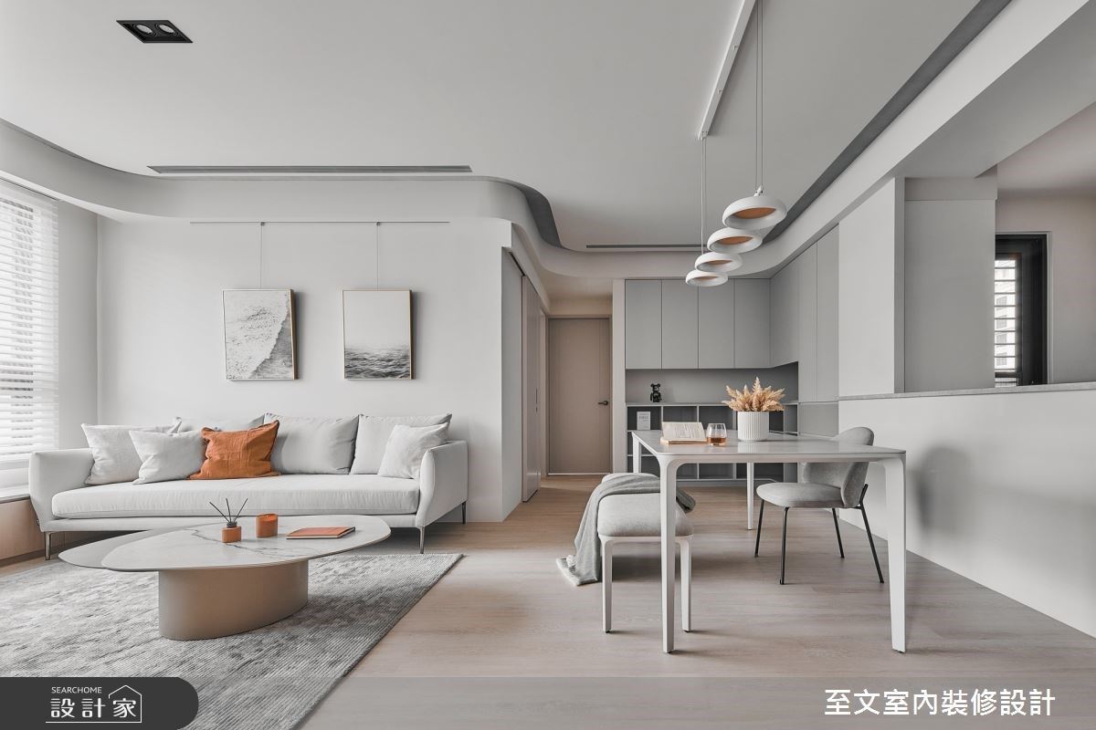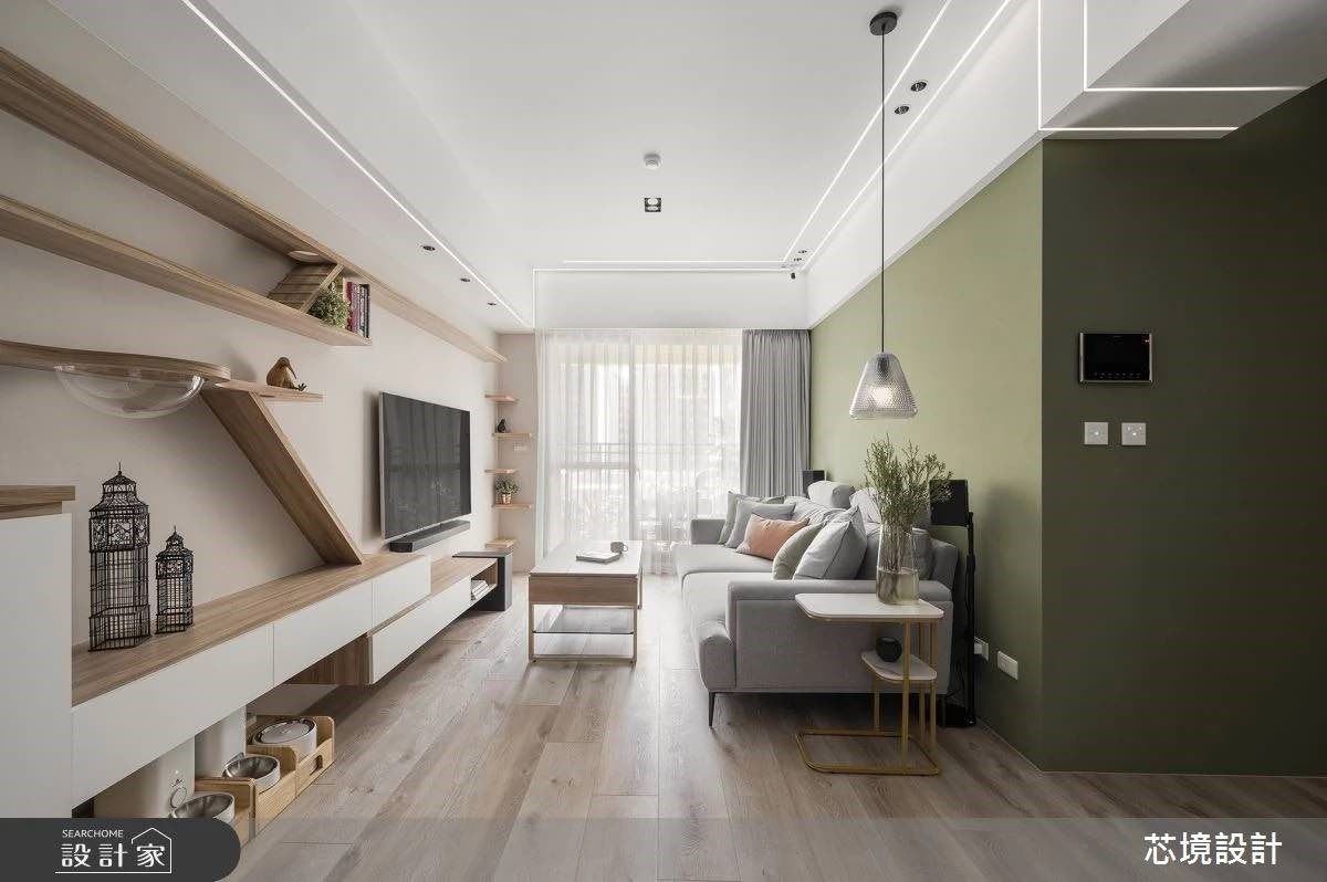設計師重新規劃格局,減少一面牆及調整一扇門,讓戶外涼風與光線更充分的進入屋內,只以一道電視牆分割客廳與書房區域,創造更多開放式空間,成功放大視覺效果。