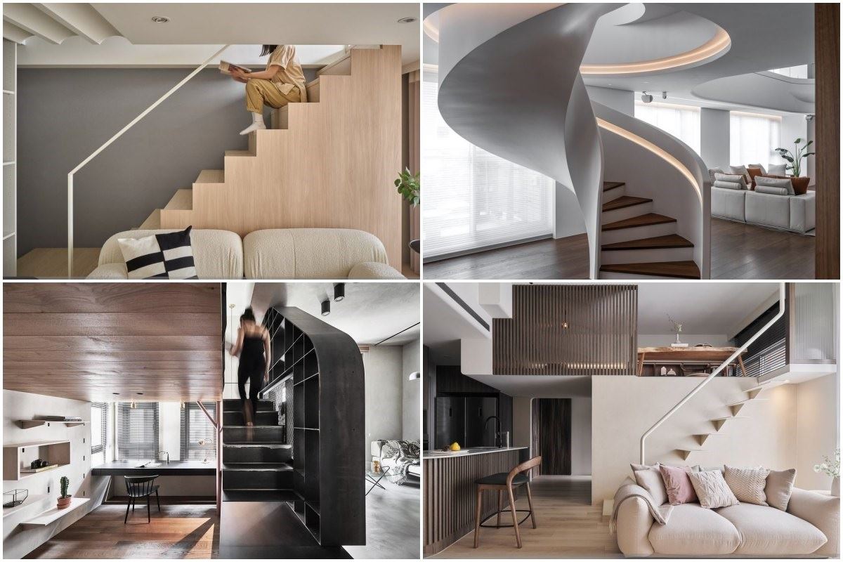 利用戶外陽台的區塊使用大面積的落地玻璃,同時搭配百葉窗,讓自然陽光可以依照自己的喜好鋪陳室內,從客廳到廚房都處處溫馨。此外,運用樓梯下方的空間在側面增設收納櫃,以虛實方塊交錯的概念豐富空間表情。