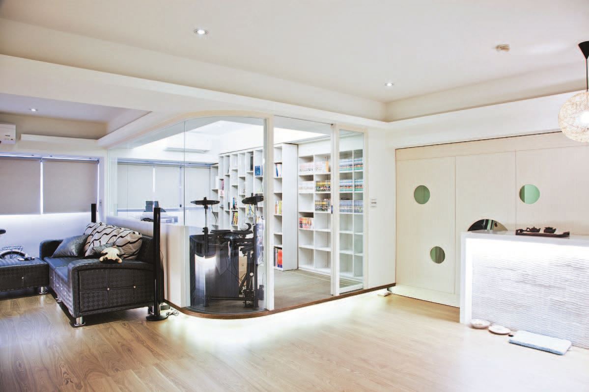 希望同時兼顧親友來訪時的宴客空間與個人的隱私空間,設計師因此延續電視背牆的造型,在公、私領域間設計了一道隱藏門,成功劃分了各個區域特性。