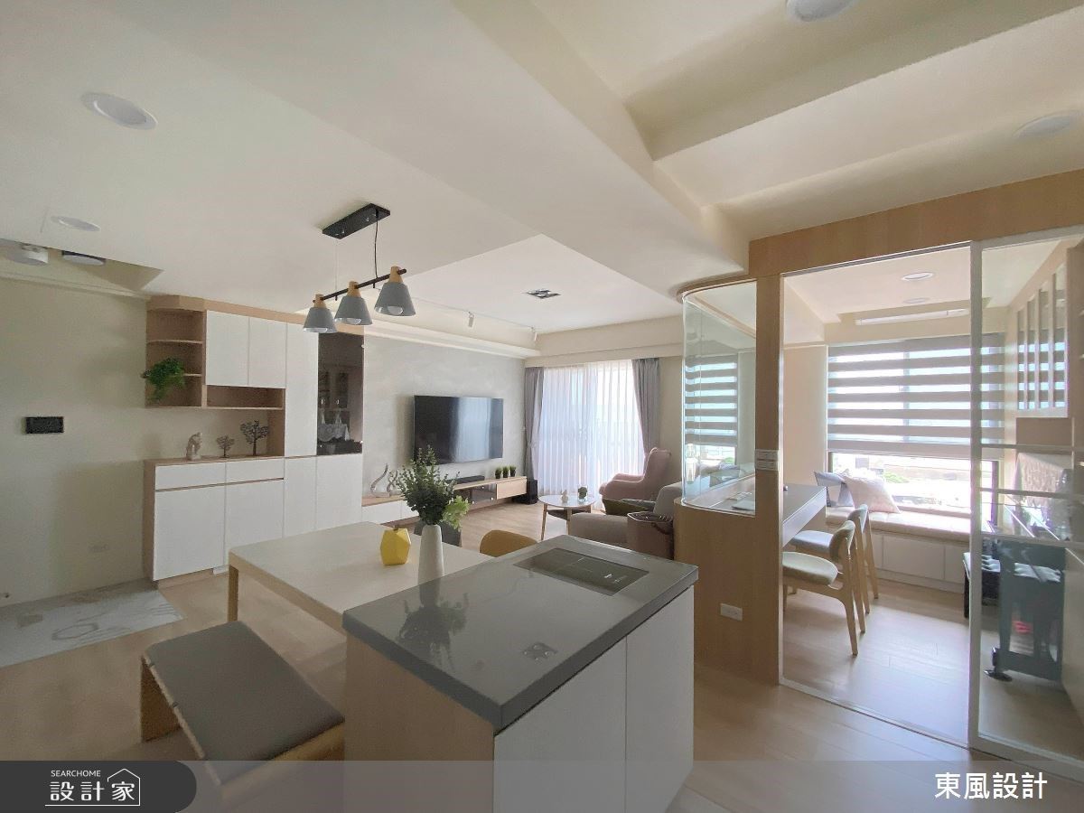 由於本案空間的整體風格以簡潔的北歐風為主,因此在視覺效果上也要求乾淨整齊,因此設計師將電視牆面設計為隱藏式收納櫃體,讓所有的視聽與燈光管線隱身其中,打造最清爽愜意的生活風景。