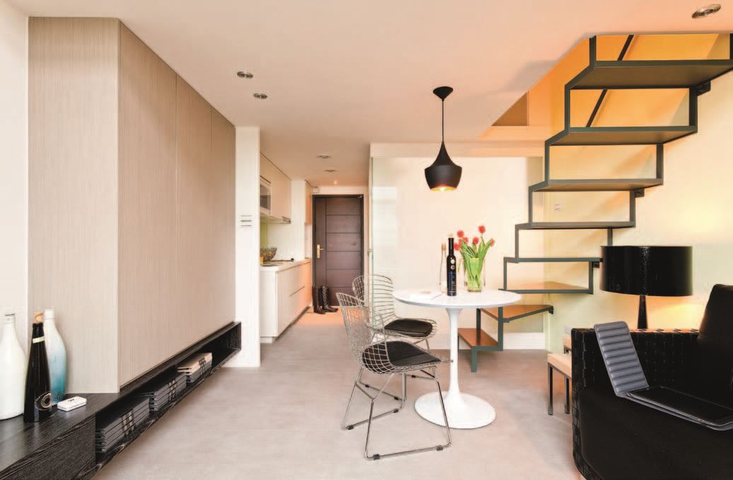小坪數空間最重視的就是收納機能設計,要是沒有良好的收納規劃,繁多的雜物將會大大破壞空間美感。設計師運用樓梯本身的量體造型進行規劃,讓收納與隔間、動線融合為一,讓收納物品完美隱藏於空間結構中。