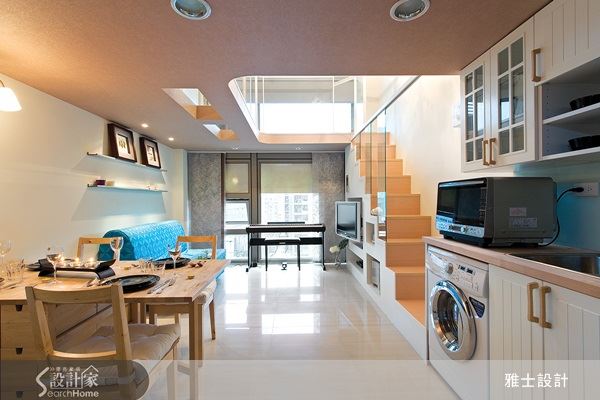 看得出來這是僅有10坪的夾層空間嗎?設計師運用不同的材質,突顯空間中不同區域的特性,讓整體感有更為豐富的層次變化。而暖色的原木質感與明亮的淺白色調相互呼應,更使空間擁有清爽的視覺效果。
