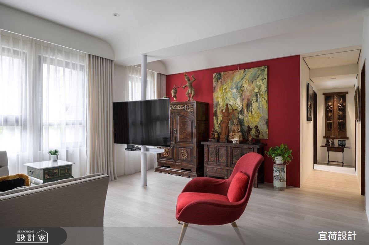 喜歡亞洲風格的Faye在玄關處也發揮巧思,保留原本地板偏西式的彩色拼磚,在大門面對的區塊以紅色的壁畫作為視覺焦點,帶有東方味的彩色山水畫,使人在踏入屋子之際便能立即感受到強烈而鮮明的東西融合特色風格。