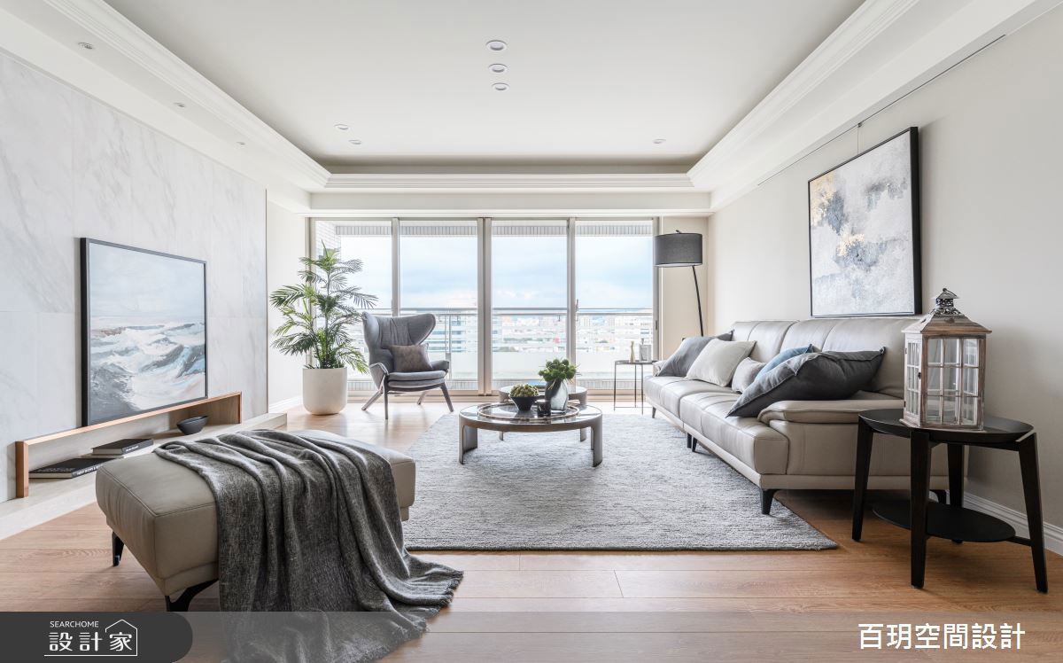 以木質和白色作為空間主要色tone,客廳以茶色沙發鋪陳溫暖氣息,沙發背牆透過造型設計,讓展示與收納可以並存,手繪的牡丹花壁畫則成為屋子的搶眼特色。