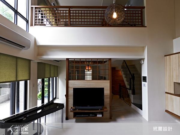 書房空間則以一面半高的電視主牆,延伸客廳的空間層次,鐵刀木浮雕木地板以斜向拼接而成的主牆設計,帶來活潑空間視覺的效果。書櫃下方則與居家廊道進行雙面櫃設計,下方是廊道收納使用的抽拉櫃體,上方則作為書房開放式書櫃、收納櫃,在有限坪數下,成功創造了豐富的使用機能。