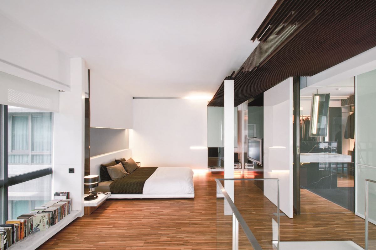 靠近玄關的入口設計成壁爐造型壁面,並且隱藏整合了收納與空調。開放格局裡,大面積拉門與玻璃作為隔間安排,其中客浴的隔牆以電漿玻璃為材,透過智慧調光控制視線的透明與不透明。高科技機能被隱藏在空間細節之處,藉著隔牆立面上演一場生動魔幻秀。