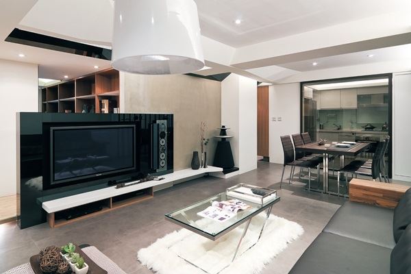 因坪數有限,以雙面隔間牆的概念設計,將電視牆結合臥房與客廳的雙面收納,並透過凸面櫃體的設計,增加空間感,且爭取更多收納空間。