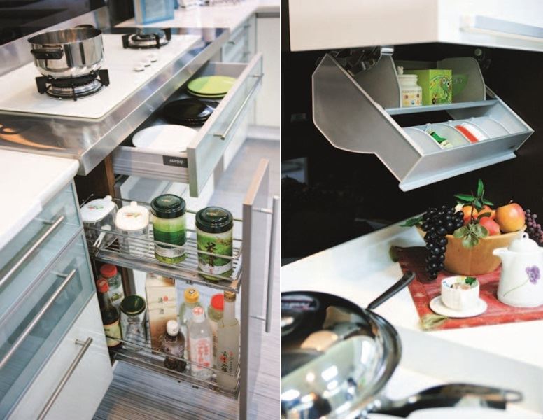 認真回想一下,阿媽時期的廚房,流理台上方其實是不會做任何櫃體的,現代廚具設備強調要聰明利用廚房的空間,但大部分的台灣媽媽要拿取最上層的物品時,都需要小凳子的幫忙,要體恤小個子的婆婆媽媽,不妨考慮在櫥櫃內加裝「下拉式升降櫃」,讓她們能輕鬆拿取上方櫃子內的所有物品。