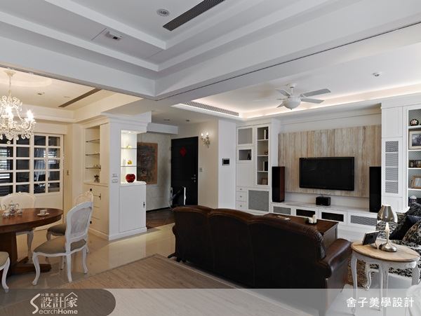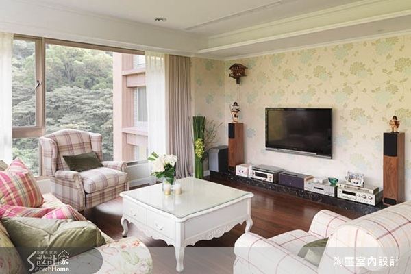 本案全室以英式鄉村風呈現恬靜優雅的居家空間。從一入門的玄關就能感受到濃厚古典鄉村氣息,玄關順應格局優勢,參考歐美居家配置,設置了融合書房及鋼琴房多功能的起居室,作為一個休憩的緩衝空間。客廳電視主牆的花紋壁紙帶有古典語彙,延伸至餐廳襯托出鄉村風典雅的氣氛,大理石檯面將電器線路隱藏收納,且沒有過多的櫃體,放大了室內的視覺空間。空間也因為主牆營造出濃厚的人文藝術氣息,搭配古典線條沙發及鄉村風格的白色茶几,誰會想到這是在台灣呢?
