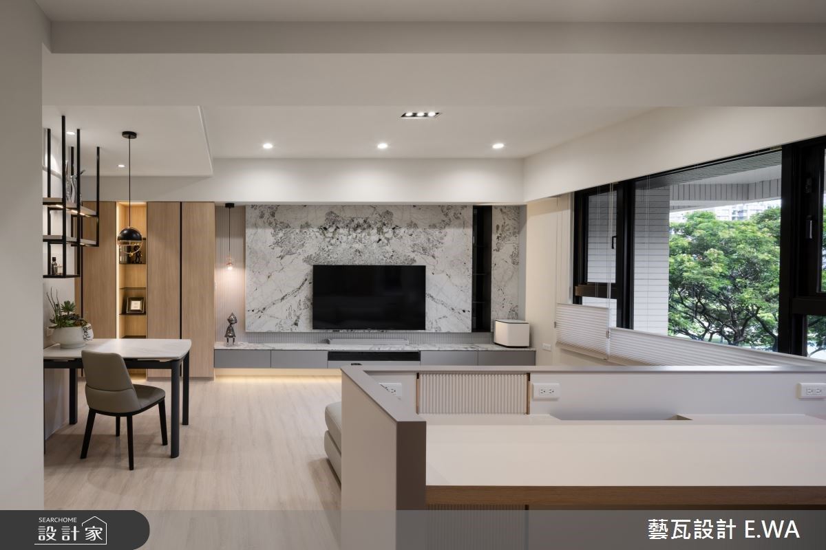 電視主牆使用粗獷樸實的文化石,讓人彷彿身處大自然,特殊的造型也烘托出電器產品金屬的精緻感,除了形成一種強烈的質感對比,也為客廳空間帶來時尚感及宛如度假飯店的細膩品味。