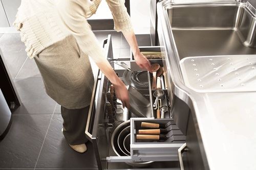 在今年的米蘭傢具展中,bulthaup推出「functional prisms」(山形功能板),由水平向V形延伸組合的山形設計,擺脫了長久以來皆走「垂直擺放」的抽屜收納的方向,水平擺放不但更符合人體工學,讓使用者不分左右手都能順暢的使用,同時也讓收納物品更一目了然。另外,使用者還可自由調整山形功能板的位置,再搭配其他延伸配件,讓使用者更能隨心所欲地改變並充分利用抽屜收納空間。