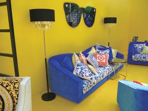 01_Versace Home系列。VERSACE依舊將色彩運用發揮得淋漓盡致。招牌黃與VERSACE的海軍藍搭配,並以金邊裝飾,完完全全把VERSACE的精神帶到空間裡。沙發以素面的黑色搭金邊,這就是VERSACE展現低調奢華的手法。