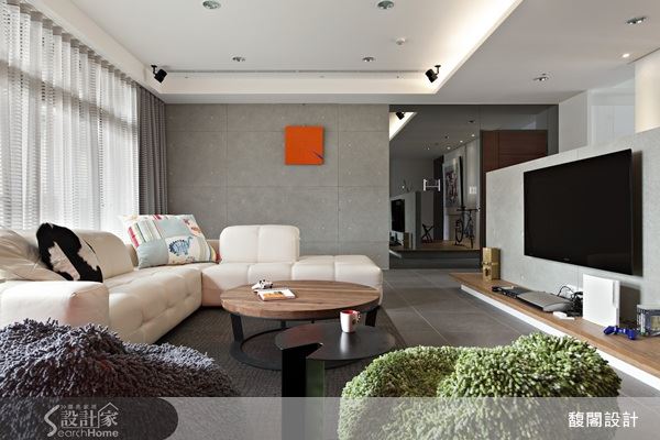客廳電視牆以整面的淺灰色木化石磁磚沉澱紊亂心緒,長達三公尺懸壁式的側柏原木平台,帶出樸實悠然的味道。靠窗處的臥榻區添休閒輕鬆氛圍。