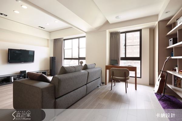 在客廳空間中,設計師結合採光優勢,以米白色系以及橡木色搭配營造電視牆的主視覺效果。在這個案子裡使用胡桃色、橡木色和米白色構成主要的顏色調性,木質的溫潤感受,豐富了空間視覺的層次感。