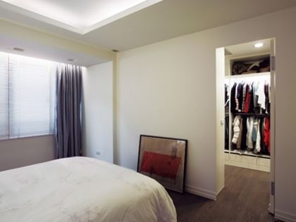 假使梳妝台找不到適合的位置可擺放,不妨將梳妝台隱藏至衣櫃或牆面中,不但解決鏡子暴露在外而照射到門或床的問題,也讓臥室空間顯得更加寬闊、一致且不雜亂。