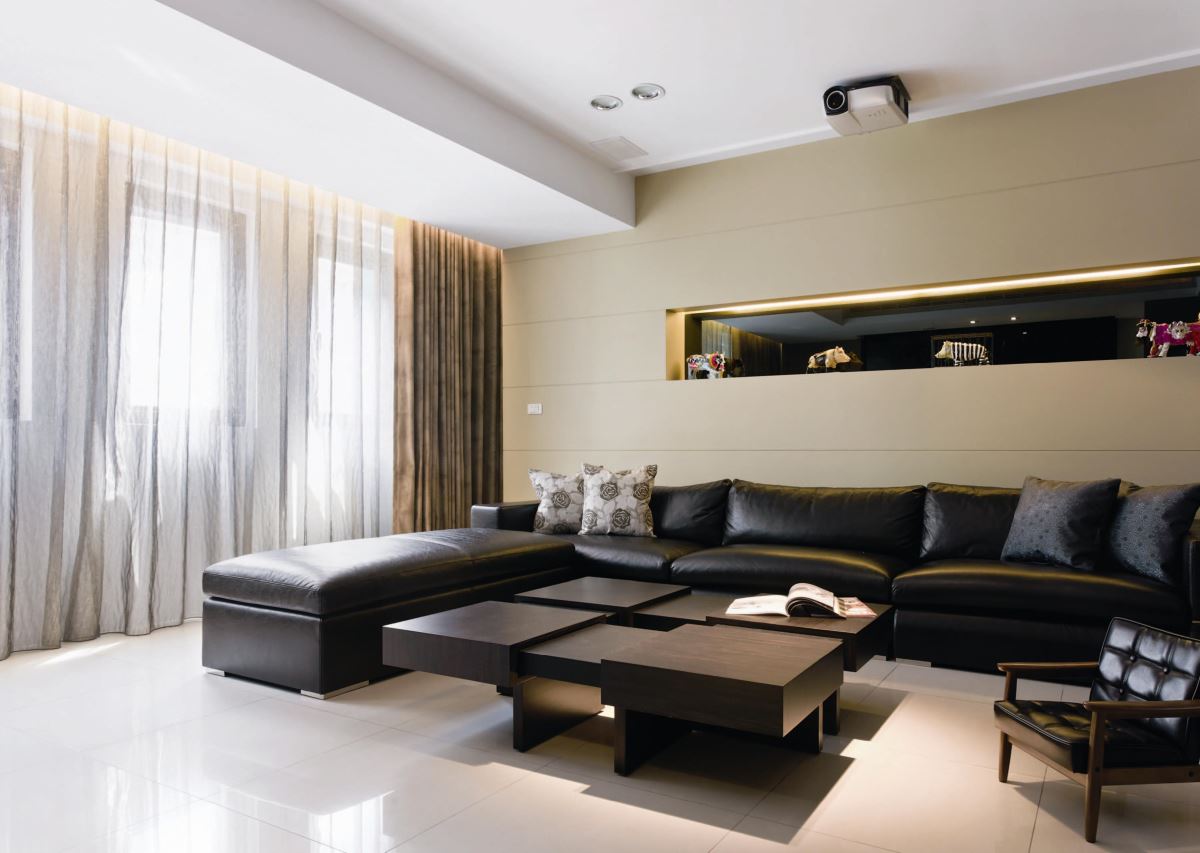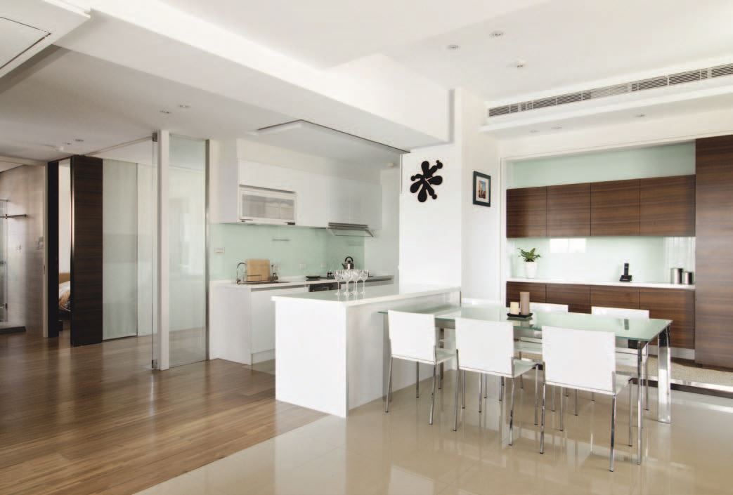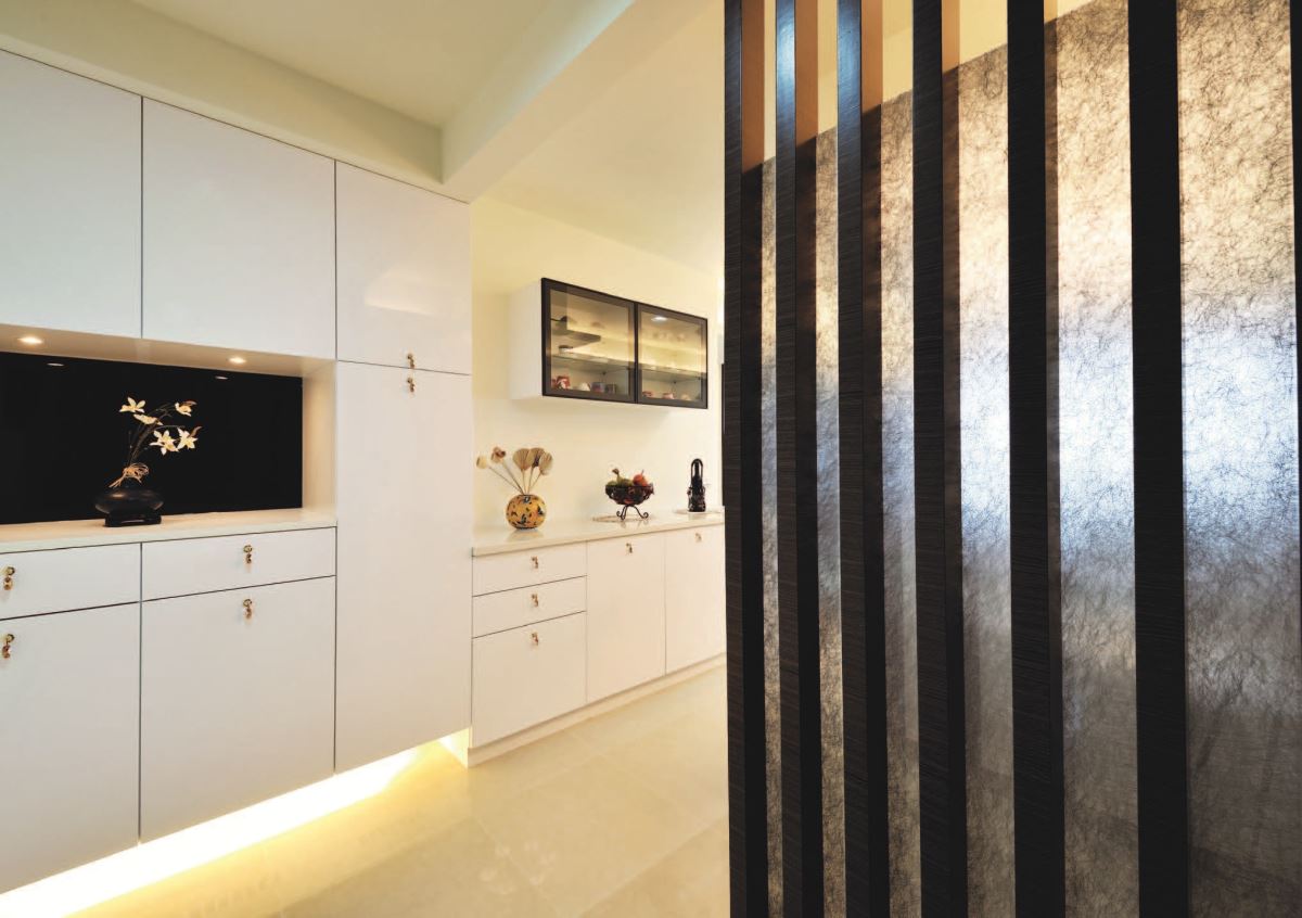 利用隔屏區隔梳妝台與房門對沖,是最方便的設計手法,而隔屏可以是設有展示櫃的玄關,也可以是具有實用功能的收納櫃,都能順利化解風水禁忌,又兼具生活需求的使用性。