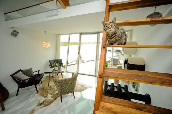 與水面相連的樓層中佈置有臥室等功能空間,河堤上原有的自然地形為臥室提供了必要的私密度,而起居室則正好可以遠眺波光漣漪的河面風景。二層則是一系列公共空間,居住者可以從廚房和餐廳眺望更高處的景色。