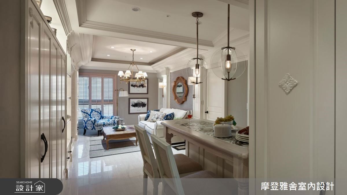 入口廊道以較低矮的玻璃鏡面櫃體引導設計主題,白色牆面裝設了日本輕藝術家Takehito Koganezawa設計的霓虹燈,為空間注入70年代氣息,廊道盡頭大片窗戶前,擺了一座圓球組合的造型立燈,作為端景也呼應幾何語彙。