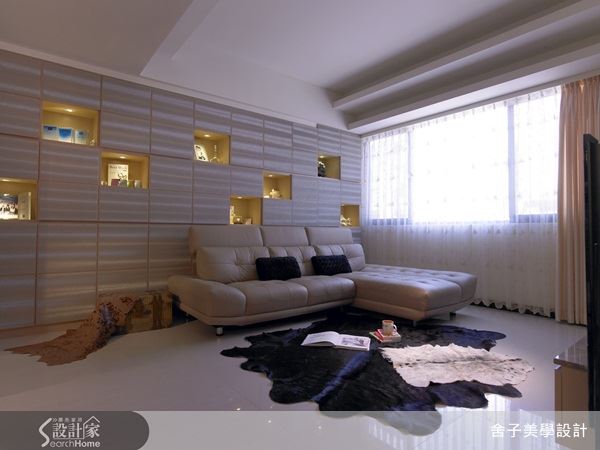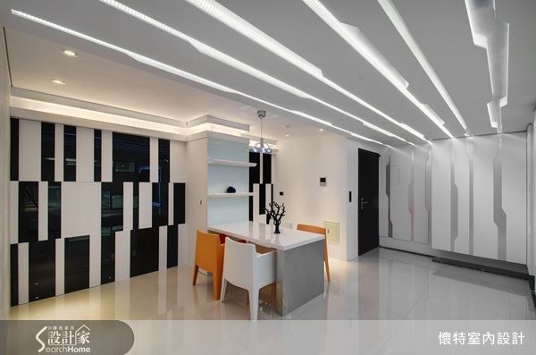 在挑高 3米6 的空間中,設計師因應屋主喜好,不走向木質規劃,而是藉由大量亮面材質做整體空間規劃,並延伸整體空間色彩,於電視牆上方以經典黑白色做收納設計,讓整體氛圍更一致。
