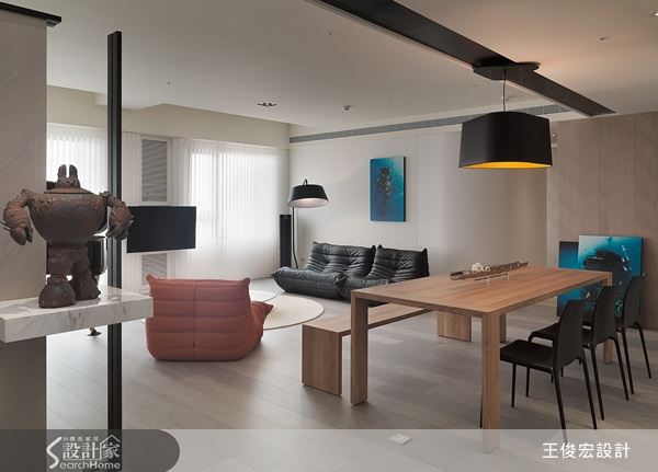 以黑色為主軸的空間,滿足屋主力求簡潔的訴求。在完全無隔阻的公共空間裡,以鐵件與鏡面材構成的玄關櫃,創造輕質量體平衡黑色空間,同時明確定位進門空間與用餐場域。