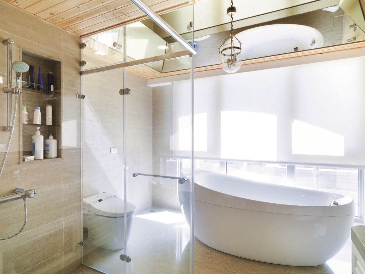 將兩間衛浴外擴加大,增加空間寬敞性,客浴以局部跳色的馬賽克磚營造低調華麗感,鏡面則利用噴砂玻璃造型製造燈光變化;主浴浴缸上加設了實木托盤,可放置精油、書籍,增添泡澡樂趣。