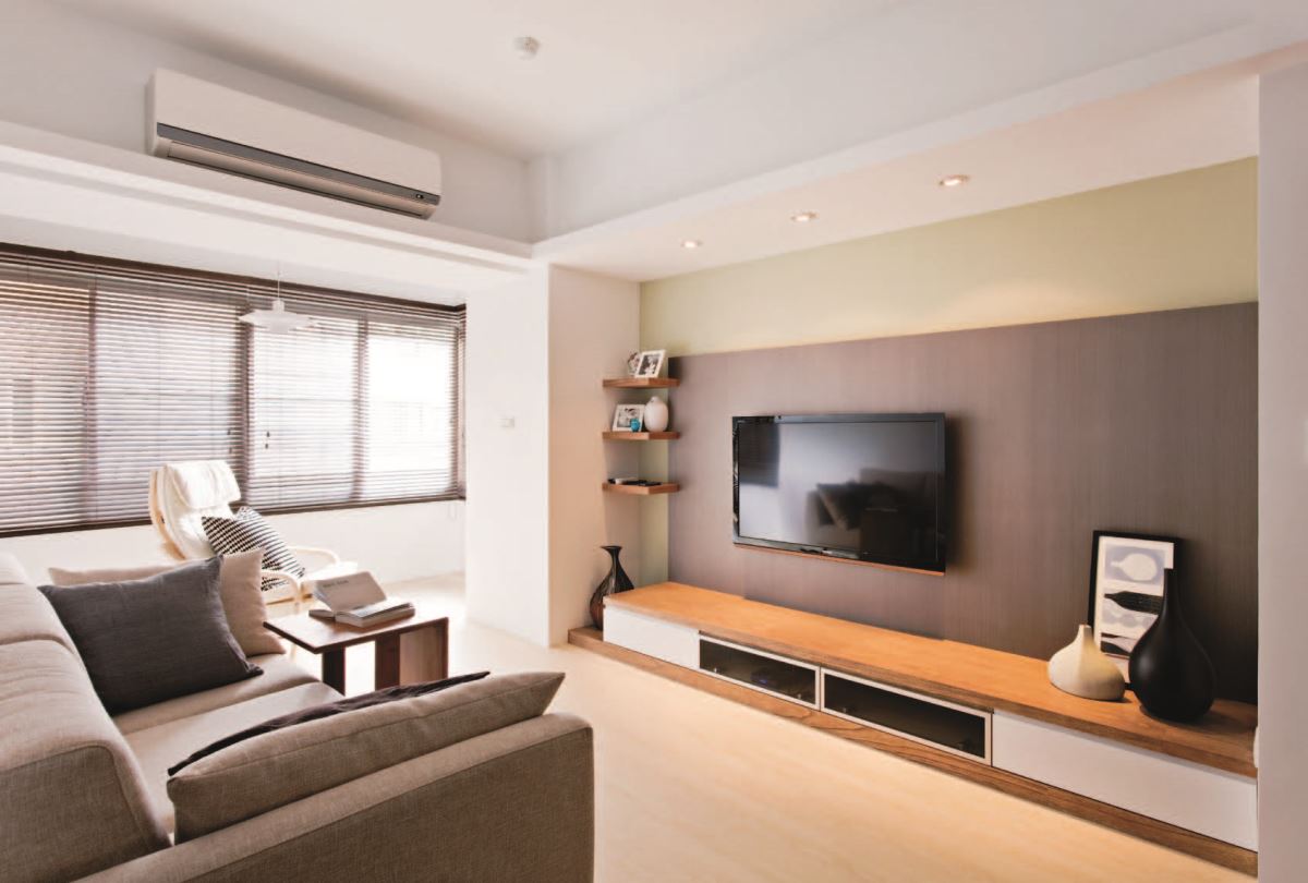 在「自然」的主軸下,大量使用木頭材質的建材,營造清新、不造作的氛圍。全屋鋪設實木地板,當赤腳踏在地板上時,能感覺到溫暖、舒服、自在;客廳的電視牆以梧桐木皮打造,牆面上並設置了露明 CD 架,除了可以隨手取得喜愛的 CD ,也讓原本單調的牆面多了活潑的裝飾。在預算考量上,為了滿足屋主的預算而達到平衡,設計師捨棄一切不必要的設計,減少裝飾性的材質,將重點放在需求大的收納上,實現屋主在有限預算內,入住心目中舒適好宅的夢想。