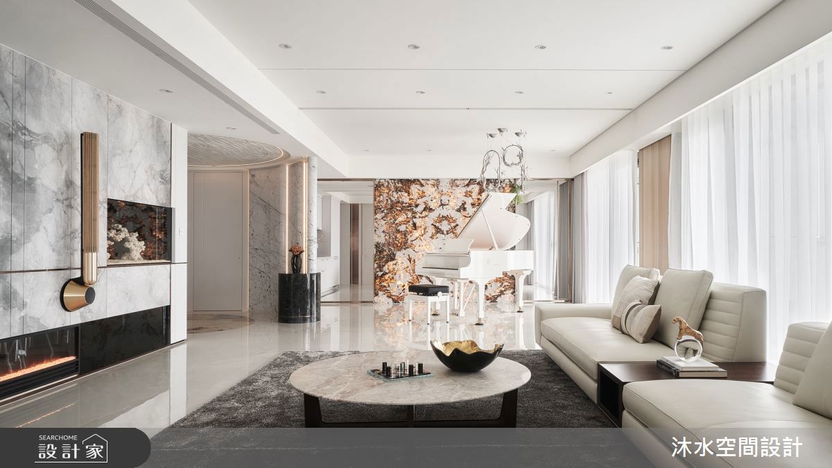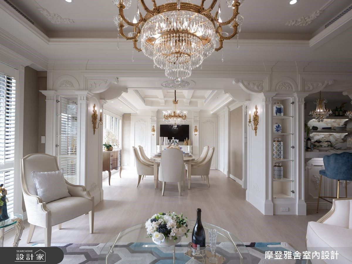 客廳特別針對電視機尺寸量身訂做了電視牆壁爐,並運用三種不同線板及造型,營造出法式古典特有的細膩繁複藝術美學,並在天花上方及壁爐各角落預留了投影布幕及喇叭、影音器材、音響等安置空間及線路。