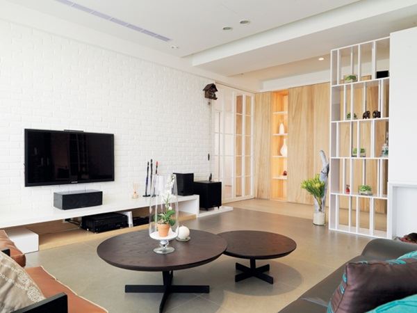 低調中顯現大器質感的淺色調空間,僅在電視牆運用大面積大理石石材。
