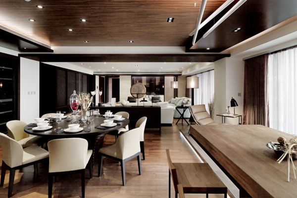 雖然雙併格局、加上 120 坪大空間使豪宅氣勢渾然天成,但也形成狹長格局,使屋主頗為擔心。因此,得比設計總監侯榮元提出宇宙核心概念,將客廳視為太陽位居中心,周圍則以行星層層相扣,分別安排餐廳、休閒區、書房以及雙端各一主臥房,展現左右開弓大格局,如此讓雙主臥更具獨立性,長輩與屋主的日常起居也更舒適。此外,因動線有公、私之別,除了從玄關進入大廳的雙主軸動線外,另外設計私密動線,以便有餐宴時,家人或傭人出入更自在。