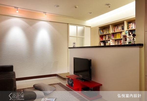 電視主牆後方除了為主臥收納空間使用,轉角設計師特別規劃一個凹槽L型空間,除了做為客廳的影音器材櫃,中段