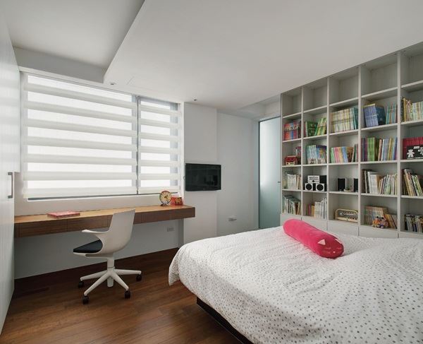 女孩房只有將近3 坪的空間,利用衣櫃深度,將書桌和櫃子整合設計,桌子上方不做天花板,利用樑下做書櫃,並透過間接照明,讓位在角落的書桌也有充足的閱讀光源。