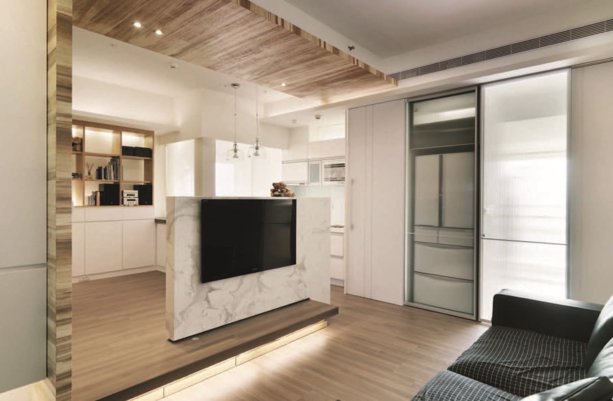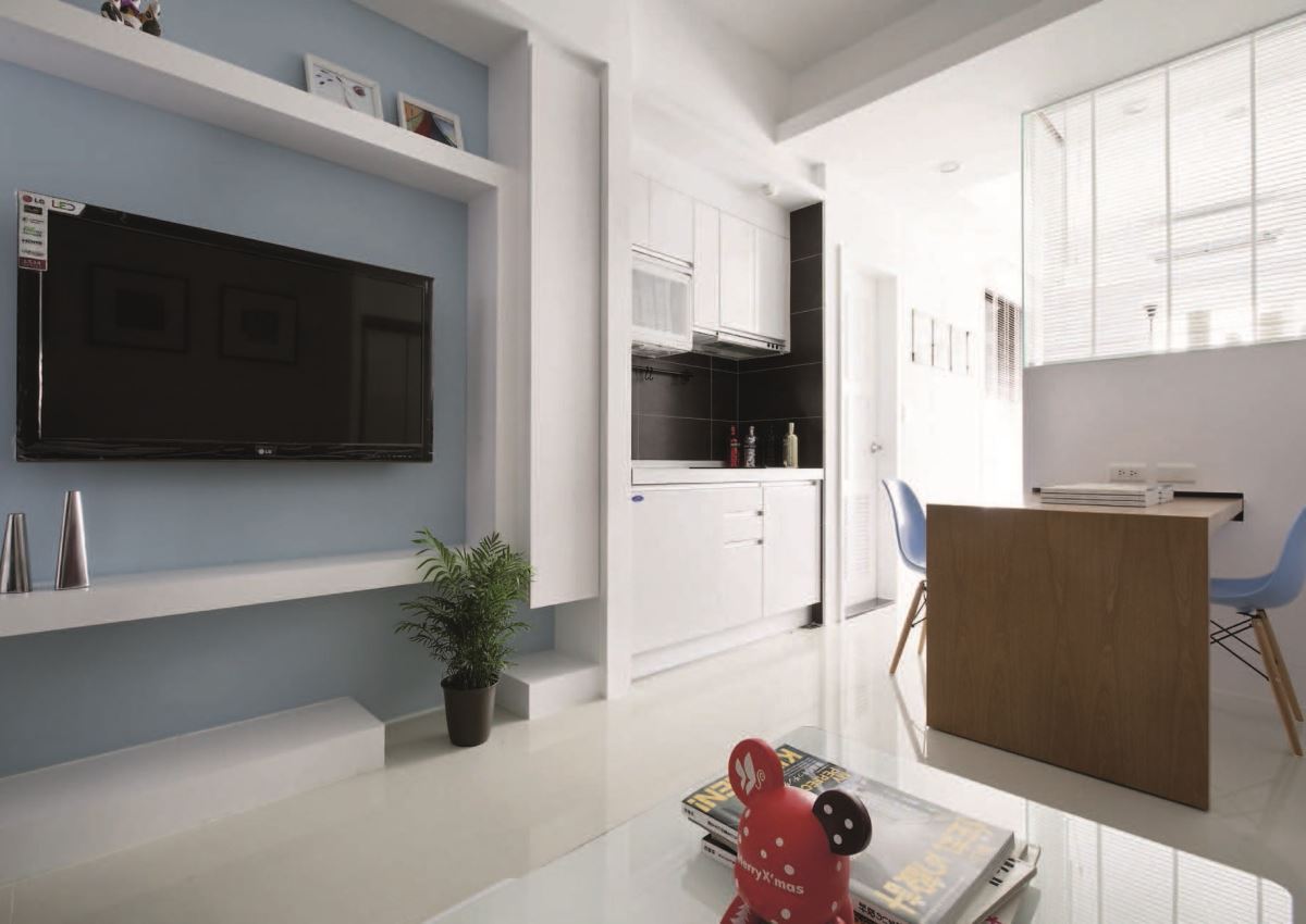01 原配置廚具不動,旁邊延伸一道檯面,電視採壁掛式擺設,檯面可放置影音設備,也可做為工作桌。(見圖3)