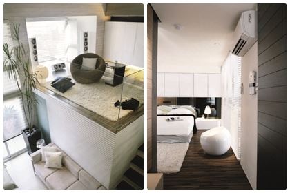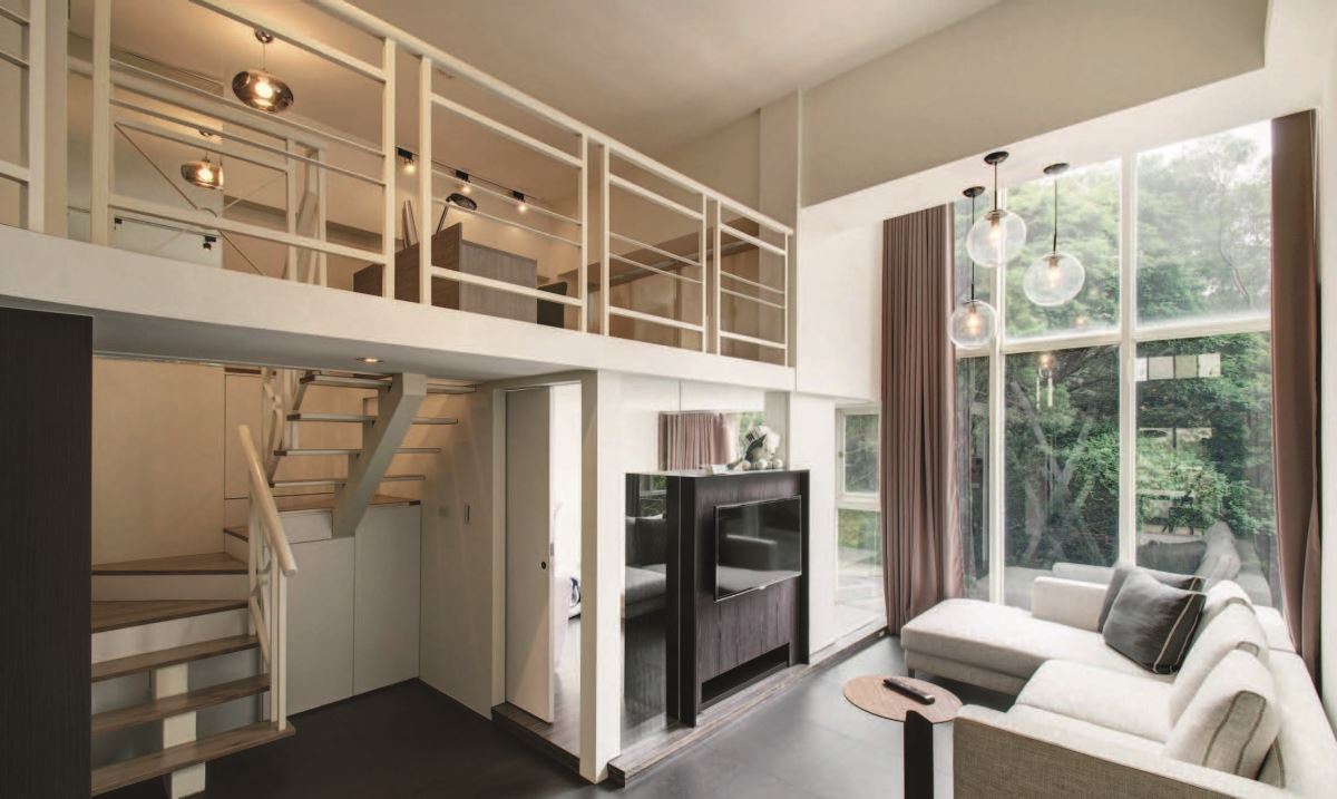 4一道檯面,兼具餐桌、書桌、視聽電器櫃功能。在原配備廚具上方增加吊櫃,可放置雜物乾糧。