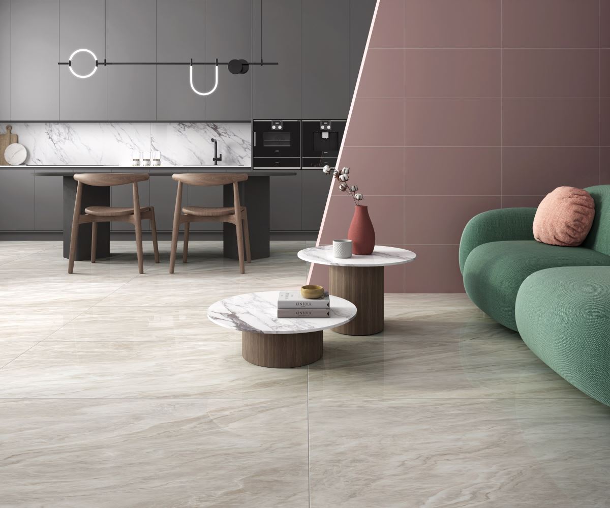 義大利不僅是創造出引領風潮的跑車、時裝、傢俱的重鎮,在磁磚設計上,也總是走在時代的尖端。近年來,MARCOBELLI 馬可貝里磁磚,以義大利設計為出發點,運用科技化的數位噴墨技術,推出讓人耳目一新的全釉拋系列,其層次豐富的自然肌理,不僅擬真效果超越以往,甚至可取代日漸稀少的天然材質,並且選擇符合現代時尚潮流的 90 × 60 cm 尺寸,讓磁磚拼貼設計的效果,能夠突破舊有框架,展現個性化的創意。