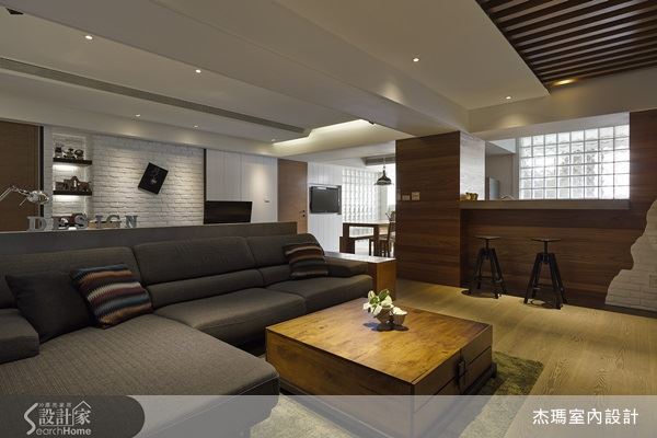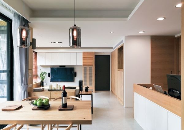 客餐廳之間以原木質感櫃體作為區隔,並且局部留下空格讓視覺得以穿透,讓空間視野不受侷限。