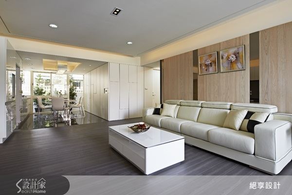 針對屋案樑位太低的問題,設計師則以高低漸層手法修飾天花板,利用線條結構層次來減輕樑壓迫的感覺,搭配幾何造型設計,讓空間感具有豐富的視覺層次感,將屋案原本的缺點轉變成空間特色。