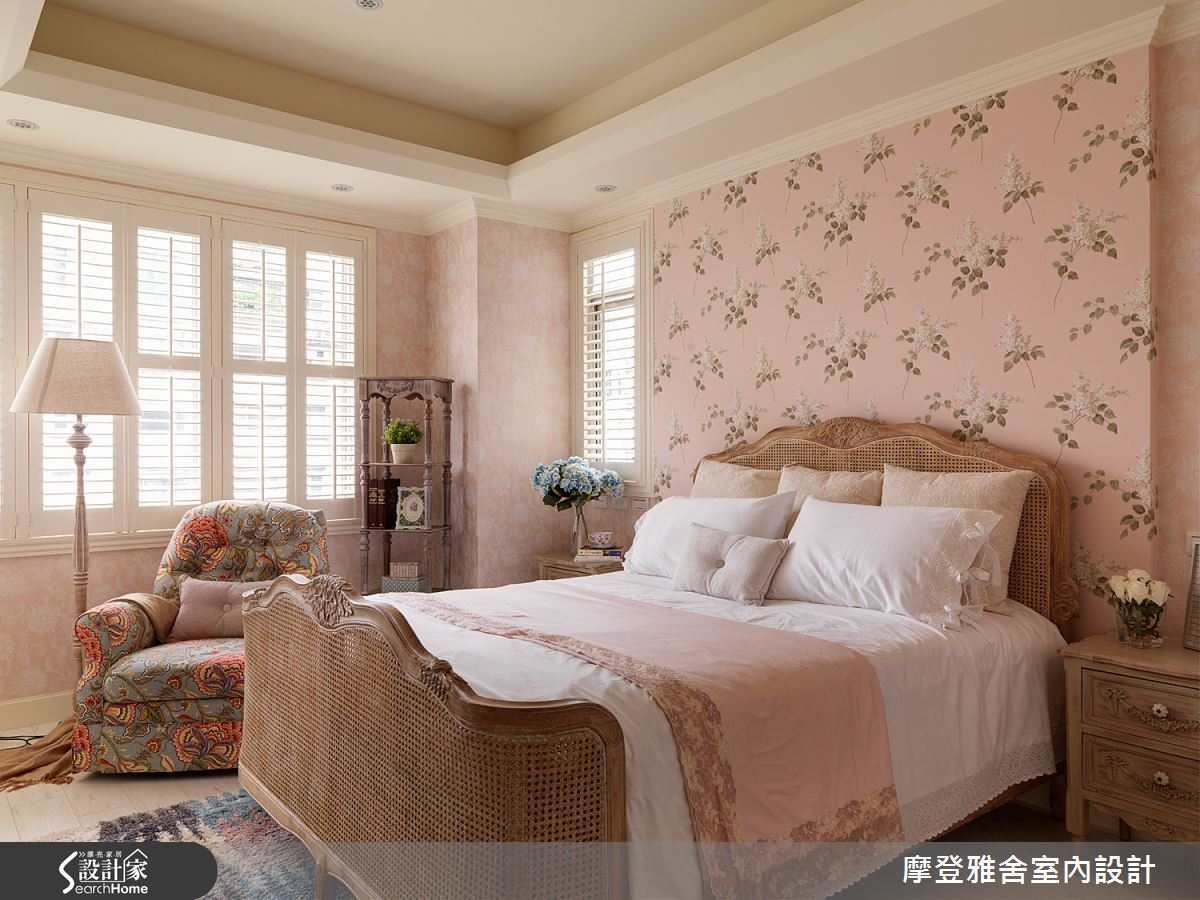 主臥運用活潑的印花床單中和沉穩色系,些微的綠色與桃紫色點亮了臥房空間。
