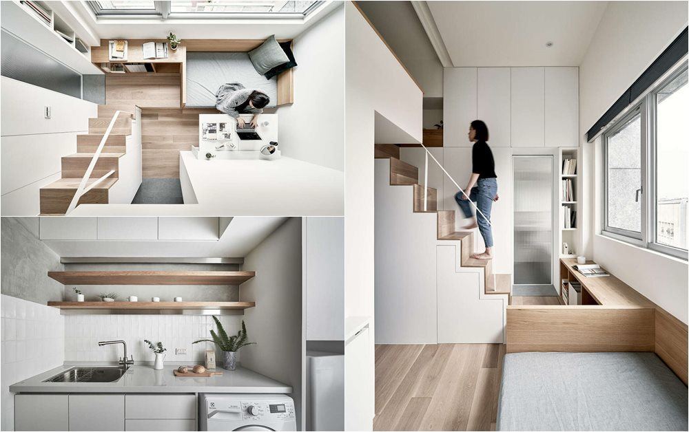 我們在 Trendir 網站發現到這個超小型的公寓,它位於馬德里的歷史中心的心臟地帶,有著合宜且舒適的單身族生活空間規劃。不出所料,設計公司 Beriot Bernardini Arquitectos 為這間小公寓設計了一系列聰明收納設計滿足生活機能,還讓空間感更寬敞,例如樓梯下方的收納櫃設計。與樓梯結合的迷你的小衣櫃可依照需求隨時拉開始用,臥房位於廚房的上方,感覺更自在透氣,取代原本小空間裡常使用的沙發床。將水槽、餐具櫃和微波爐隱藏起來,特別為這個空間打造的膠合板家具,讓空間使用更為緊湊。對於微型公寓來說,提供足夠的收納空間就可滿足基本的生活機能。全白的家具充滿了整個生活空間,在有限的空間裡,微型公寓還能擁有公共空間、浴室、廚房和私人的睡眠空間。當處理小空間時一定要善用每寸空間,讓空間被聰明的” 剝削”。