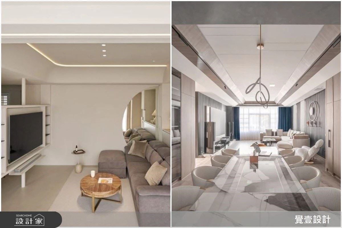 以淺色系為主色調搭溫潤的木建材,讓空間顯得溫暖不單調,電視牆下方擺放的燭台和高貴奢華水晶燈,為空間增添幾分時尚
