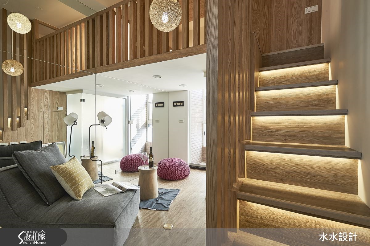 一進入客廳,沉靜放鬆的日式禪風氣息,讓一身的疲憊似乎都消失了! 雖然坪數不大,但是寬敞舒適是不能少的,設計師盡量保持天花板的高度減少壓迫感,提升空間感,天花板的嵌燈設計可以減少工程施作,降低裝修預算,為了增加收納空間,客廳的沙發背牆則規畫成整面書牆,可擺放書本也可擺放藝術品和收藏品,為空間增添幾分人文氣息,深色的木櫃體和茶几搭配米色布質沙發,深淺色調的搭配讓空間有更多層次,電視牆選用具有反射效果的鏡面材質與燈光的互相搭配下,讓空間更顯明亮舒適。開放式的餐廳和廚房設計,保持空間的寬敞和通透,設計師特別規畫高度約 1 米的吧台,做為與客廳的空間界定,簡單時尚的吧檯設計也可做為餐桌使用。臥室的簡約舒適延續著公共空間的色調和風格,木質地板和溫新的燈光設計,展現放鬆無壓的氛圍。