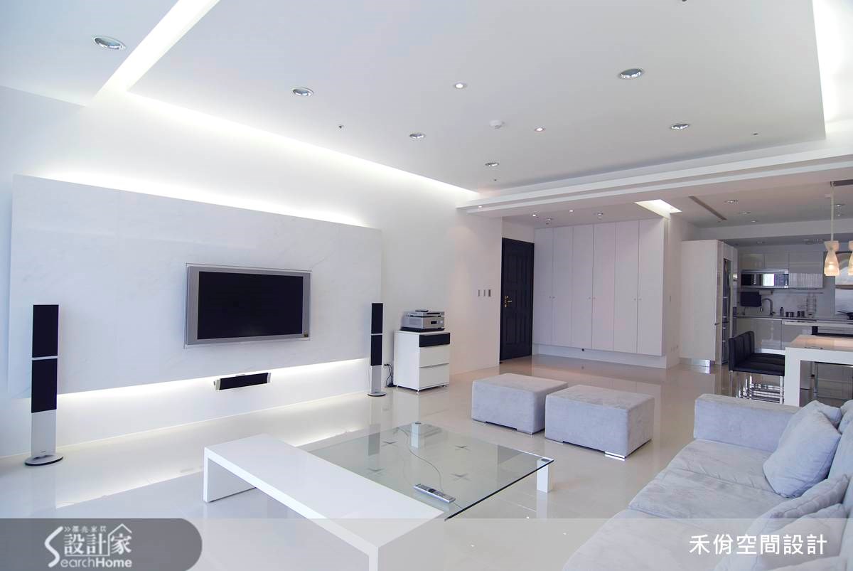 公共空間採用開放設計,保持空間的寬敞感,並利用地坪的高低來做為各領域的界定。客廳,擁有自然紋理的木建材搭配溫暖昏黃燈光設計,在淺色空間裡,營造放鬆紓壓的氛圍。簡約的餐廳設計,沒有多餘的裝飾,簡單的白色餐桌椅,帶有時尚感的吊燈,讓人可舒服自在的在此用餐,在一旁的中島吧檯,流暢的弧形線條,並添加烹飪的工作區,除了三五好友可在此享受輕食談天外也能做點簡單的料理。私領域的空間規劃,則延續公共空間的風格,隱藏式的收納櫃體,讓空間更顯得簡約清爽,圓弧型的造型天花板,則為空間增添幾分柔和感。
